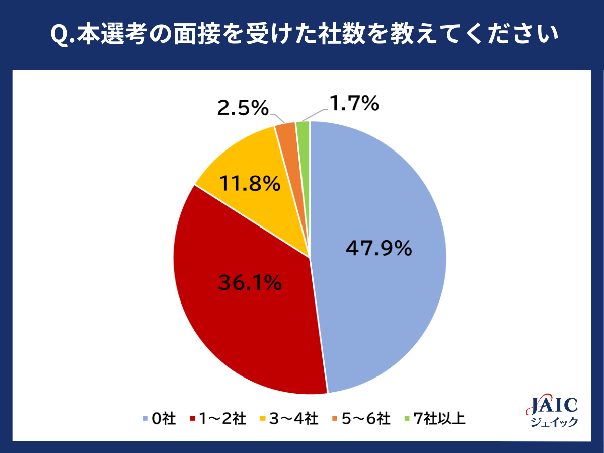 「本選考の面接を受けた社数を教えてください」と質問したところ、「0社」が47.9%、「1~2社」が36.1%、「3~4社」が11.8%、「5~6社」が2.5%、「7社以上」が1.7%となり、全体の5割以上(52.1%)が1社以上の面接選考に進んでいる結果となりました。