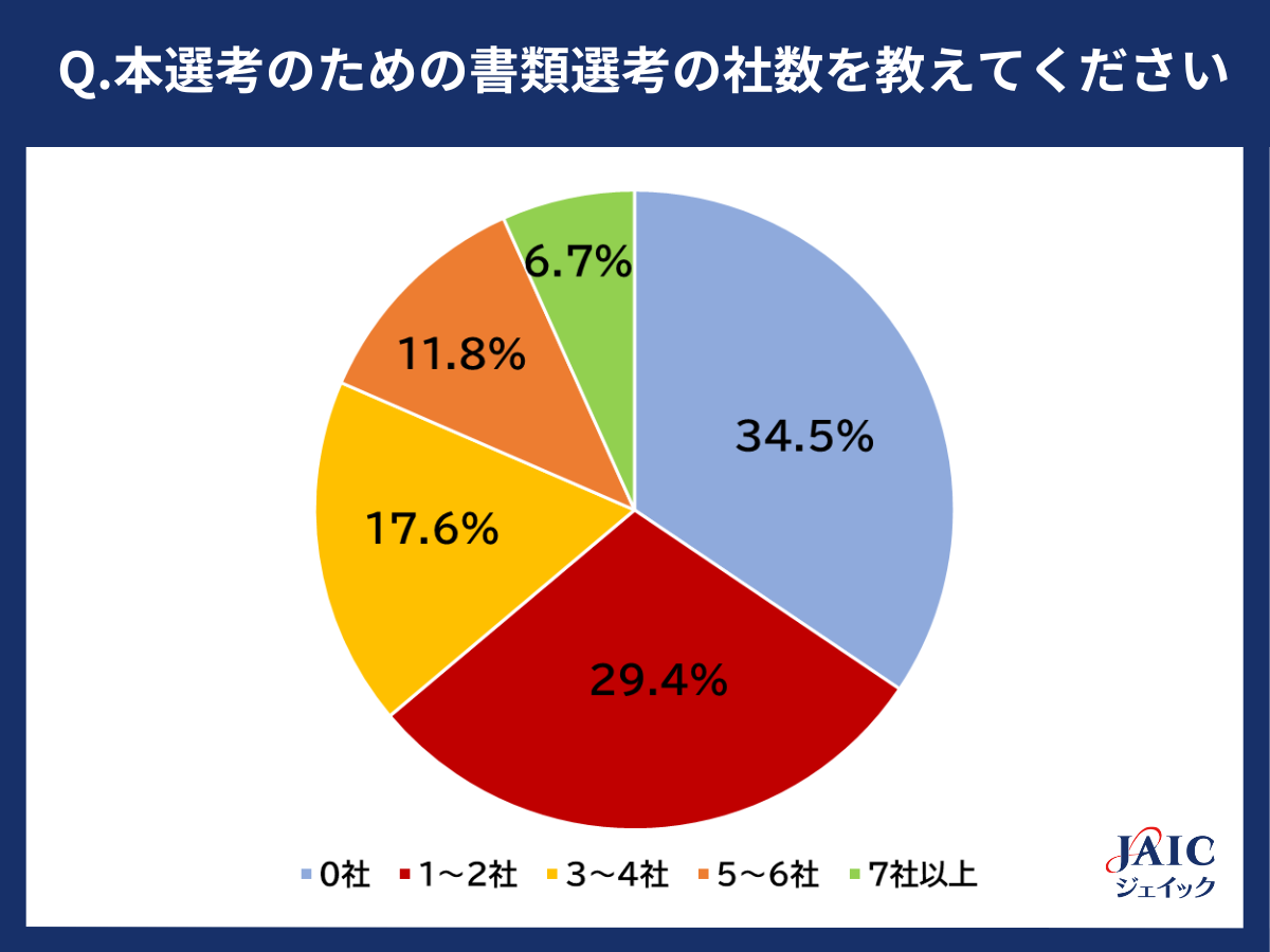 「本選考のための書類選考を受けた社数を教えてください」と質問したところ、「0社」が34.5%、「1~2社」が29.4%、「3~4社」が17.6%、「5~6社」が11.8%、「7社以上」が6.7%となり、全体の約7割(65.5%)が1社以上に応募している結果となりました。