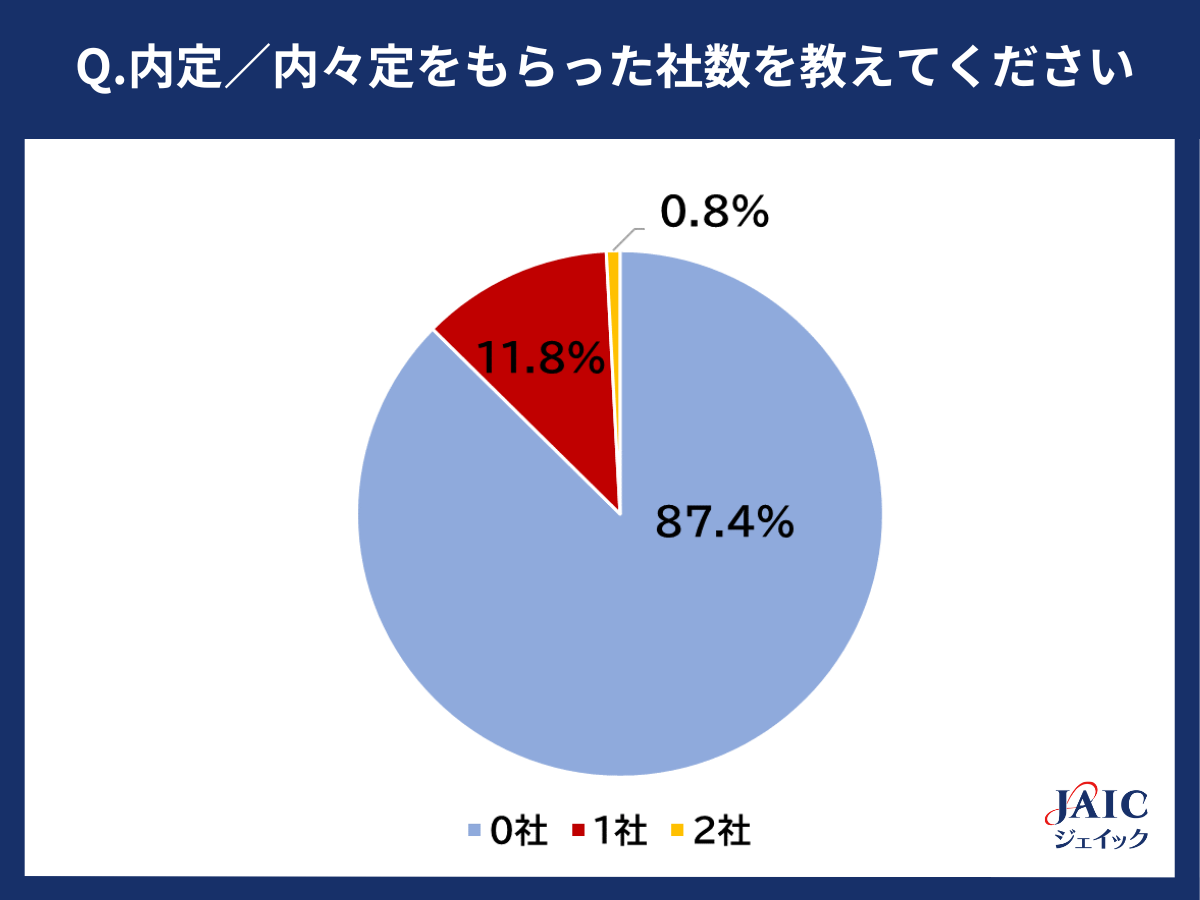「内定/内々定をもらった社数を教えてください」と質問したところ、「0社」が87.4%、「1社」が11.8%、「2社」が0.8%となり、12.6%が内定/内々定を獲得しているという結果となりました。