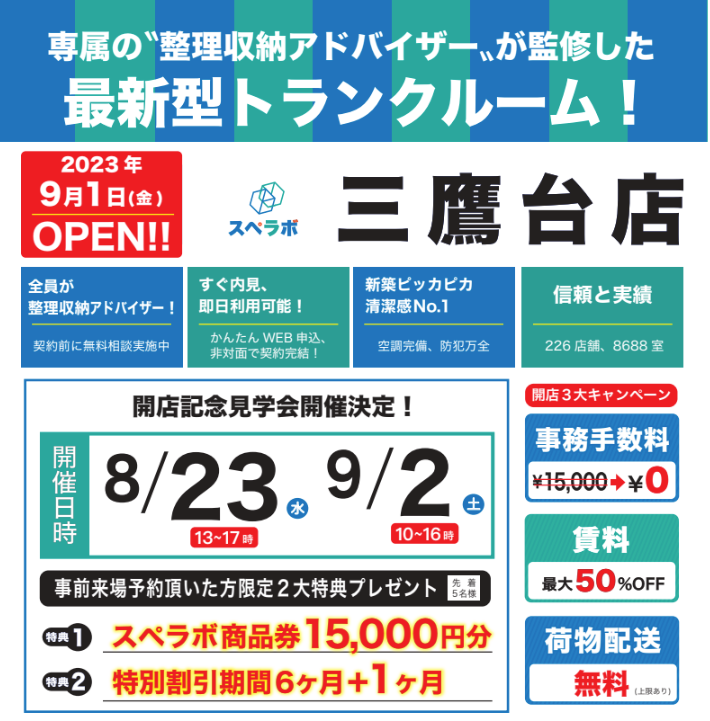 【三鷹台店/9月1日(金)オープン】見学から契約、解約まで完全非接触・非対面、お申し込みからご利用まで最短1時間!都内、大阪などにて絶賛運営中のトランクルーム【スペラボ】が三鷹台駅近くに出店!