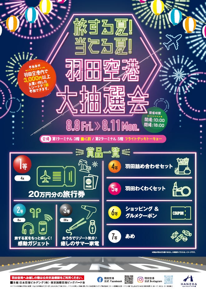 羽田空港第1・第2ターミナルでは、8月8日(金)~11日(月・祝)の4日間、豪華賞品が当たる抽選会を開催します。