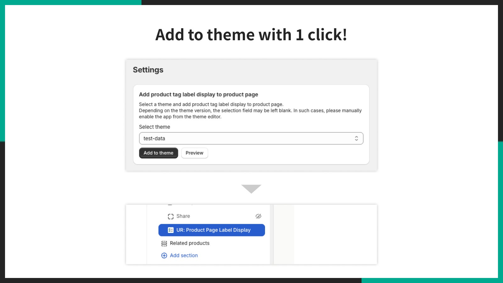 アプリをインストール後、ワンクリックでテーマに追加でき、すぐに商品ページへラベル表示を反映できます。