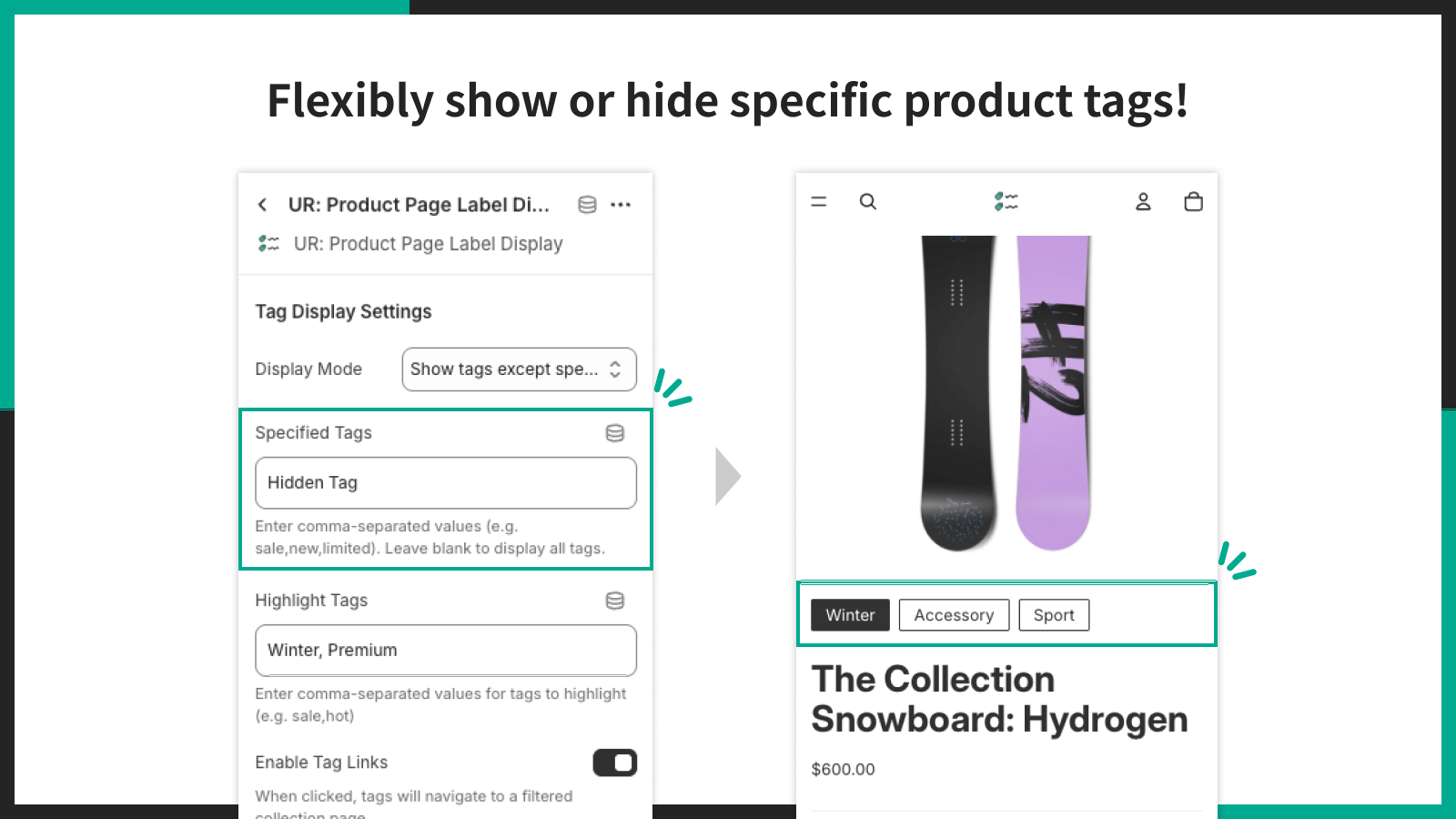 商品タグごとに表示・非表示を柔軟に切り替えられるほか、指定したタグのみを強調表示することも可能。色やテキスト、スタイルなどの見た目もノーコードでカスタマイズできるため、ブランドイメージに合わせたデザインを手軽に作成できます。