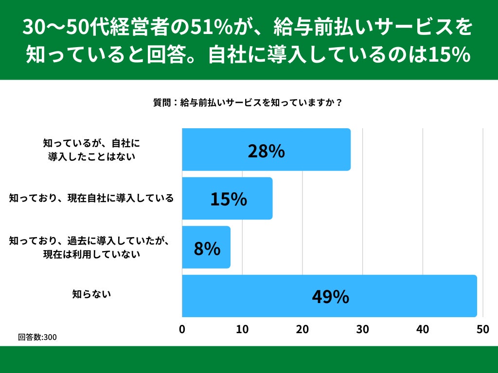 30~50代経営者の51%が、給与前払いサービスを知っていると回答。自社に導入しているのは15%【給与前払いサービスに関するアンケート】