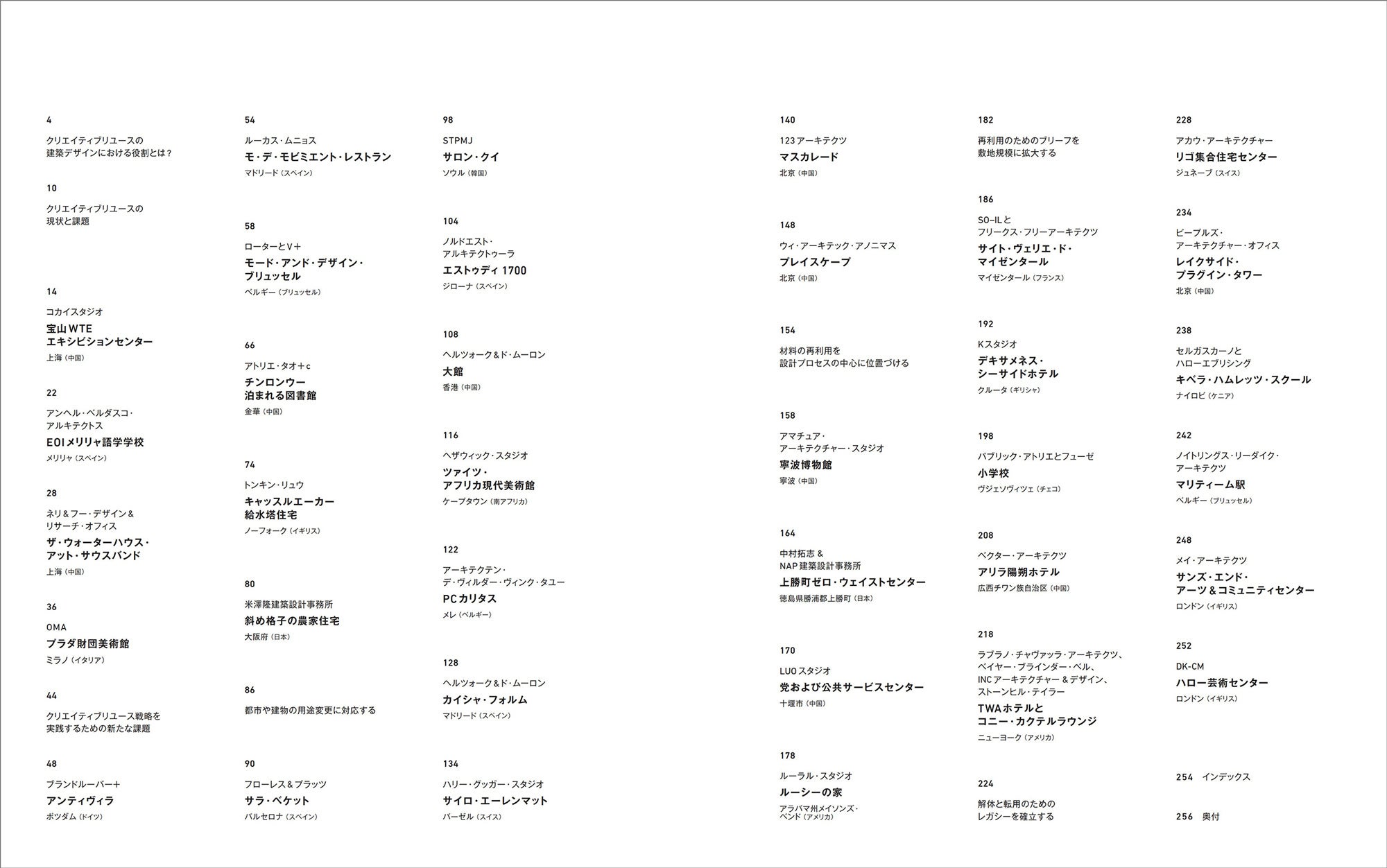 本書では世界有数の建築家による創造的リユース、リサイクル戦略を幅広く網羅。政府庁舎から芸術センターへ、マーケットから音楽院・語学学校へ、住宅から住宅へと、リノベーションによって新たな価値を備え、生まれ変わった建築実例を、日本を含めた35例掲載。