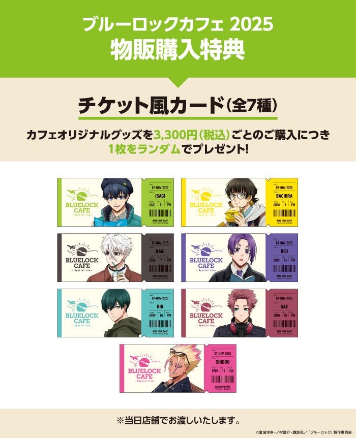 ■物販購入特典:カフェオリジナルグッズを3,300円(税込)ごとのご購入につき「チケット風カード(全7種)」をランダムで1枚プレゼント。