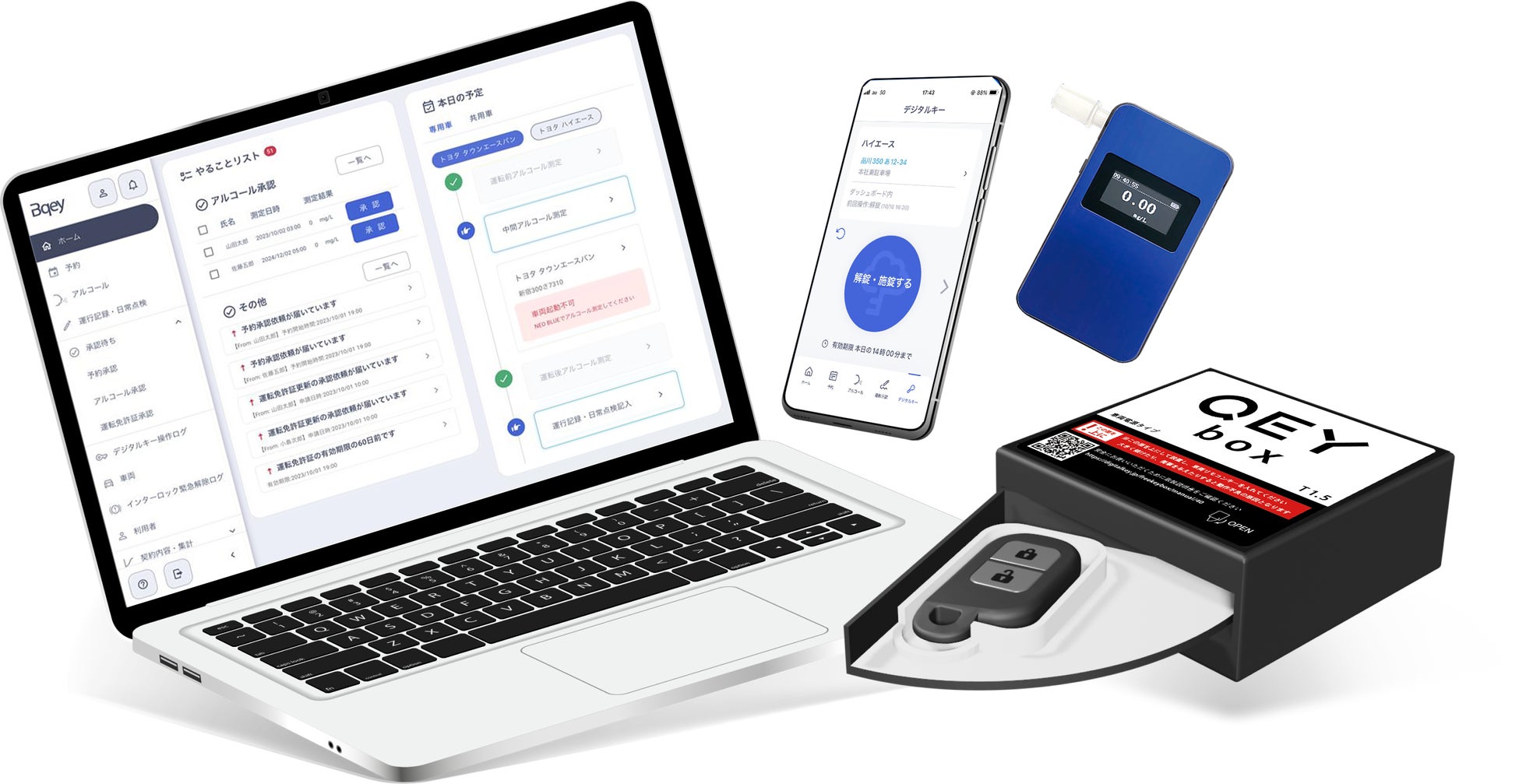 Bqeyは、運転前後のアルコールチェックが実施されていない場合のアラート機能や、顔写真撮影によるなりすまし防止機能に加え、チェック未実施の場合や基準値を超えるアルコールが検知された場合に車両の起動を制御し、エンジンがかからなくなる「アルコール・インターロック」機能も搭載しています。これにより、アルコールチェックの形骸化や不正を物理的に防止し、法令に則った厳格な飲酒運転対策をサポートします。