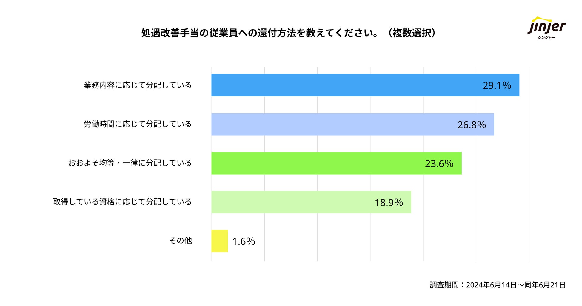 当社が行った調査で「処遇改善手当※の分配方法」について質問したところ、「業務内容に応じて分配している(29.1%)」、「労働時間に応じて分配している(26.8%)」「おおよそ均等・一律に分配している(23.6%)」「取得している資格に応じて分配している(18.9%)」という結果になり、事業所によって分配の基準は様々であることが明らかになっています。