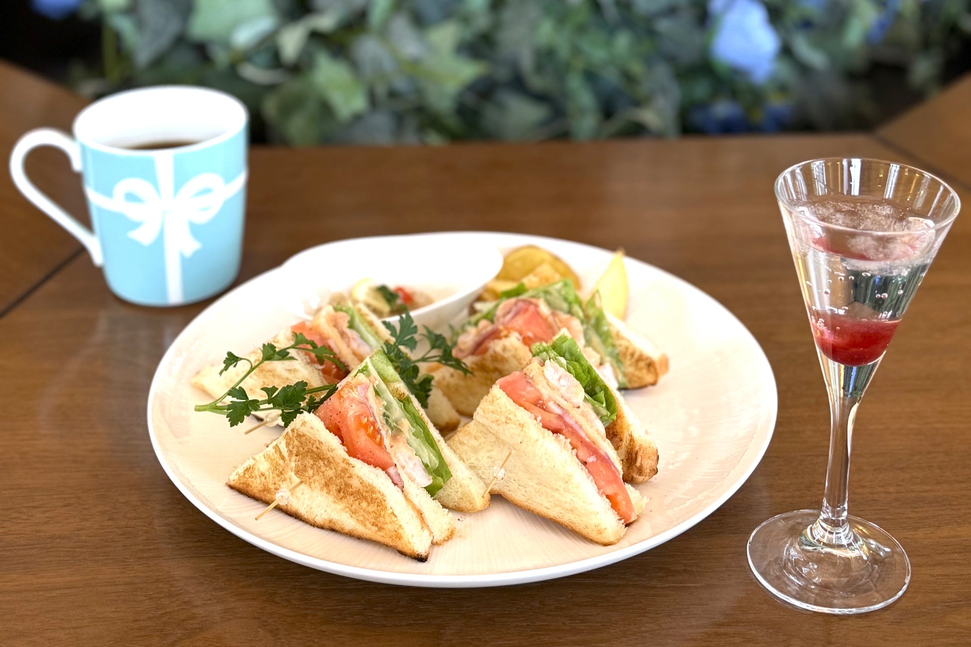 ローズシロップのスパークリングウェルカムドリンク付BLTSサンドのセット。(セットドリンク含む)BLTSサンドの由来は、一般的なベーコン、レタス、トマトの他に、縁起の良いシュリンプ(海老)が入っています。一色堂茶廊がこれからも末長くお客さまから愛され続けるようにと願いを込めています。