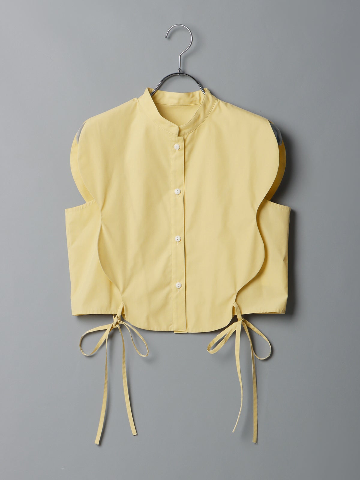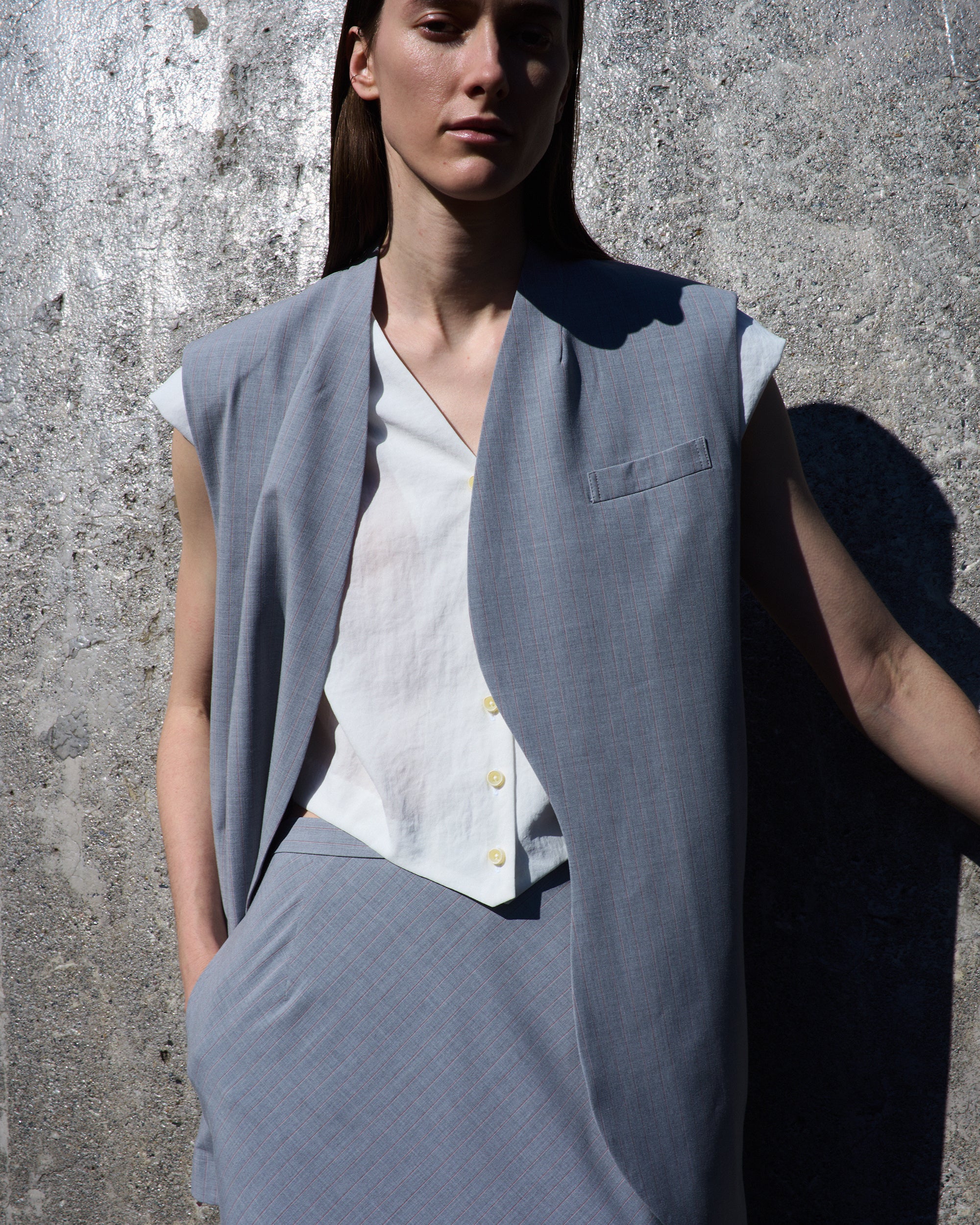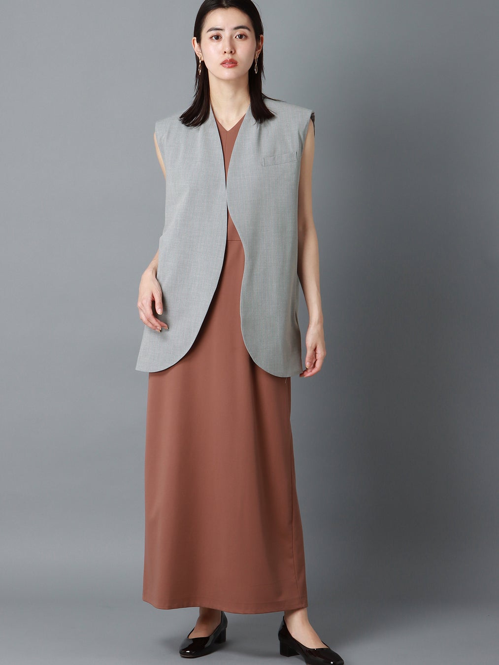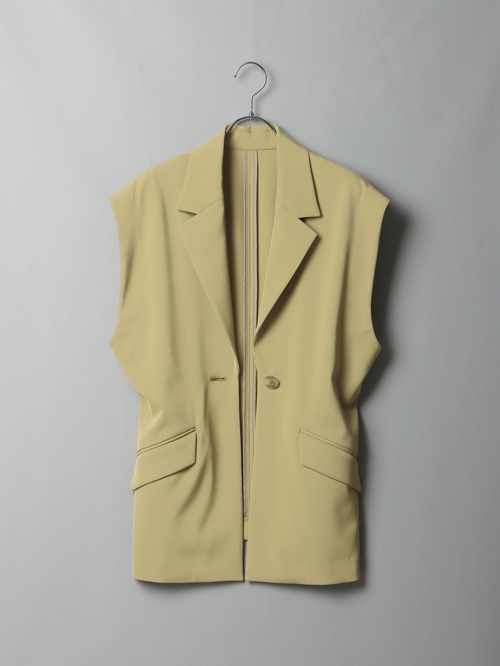 ほどよいリラックス感がある、開きが大きいアームホールや縦長のシルエットが特徴的な、ノースリーブタイプのジャケット。背面にはウエストの絞りを変更できるボタンがついているため、1枚でもシルエットの変化を楽しめます。