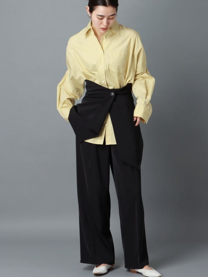 肩から肘にかけて切り替えがあり、肘下にタックを入れることでボリュームを持たせた構築的なデザイン。ビッグシルエットながらも薄い生地を使用しているため、ジャケットインでもかさばらず、夏場の羽織としても活躍します。