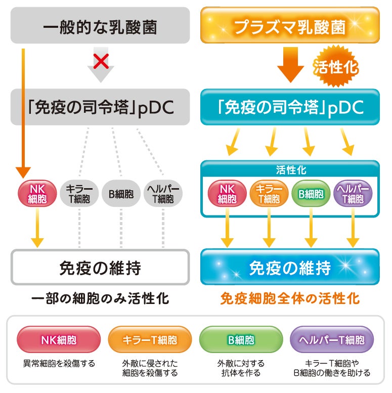 本品には、プラズマ乳酸菌(L. lactis strain Plasma)が含まれます。プラズマ乳酸菌はpDC(プラズマサイトイド樹状細胞)に働きかけ、健康な人の免疫機能の維持に役立つことが報告されています。