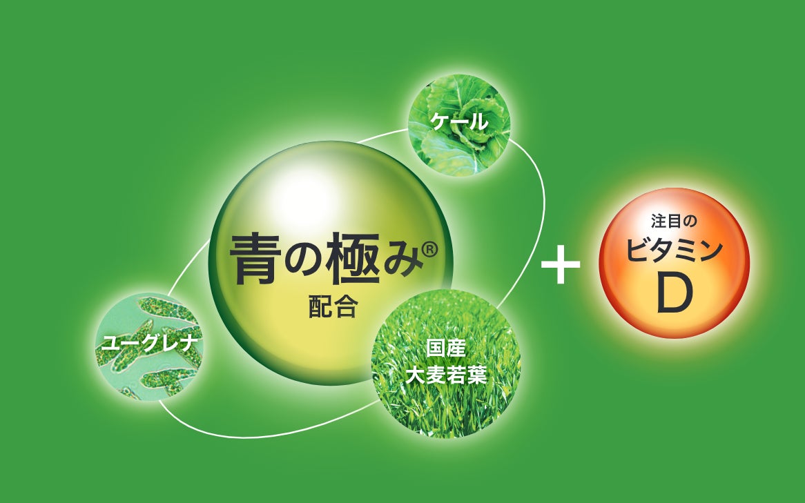 さらに、大麦若葉、ケール、ユーグレナの3つの自然の恵みをバランスよく組み合わせた青の極み®を配合。注目のビタミンであるビタミンDを配合しました。粉末タイプで、そのまま飲んでもおいしい乳酸菌飲料風味です。