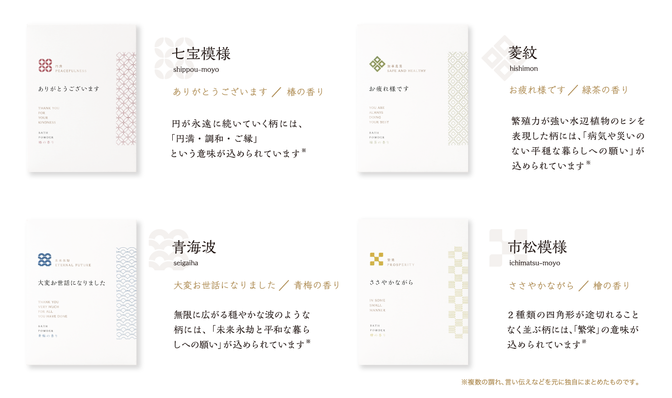 縁起の良い4種の吉祥文様に、心あたたまるご挨拶の言葉をのせました。