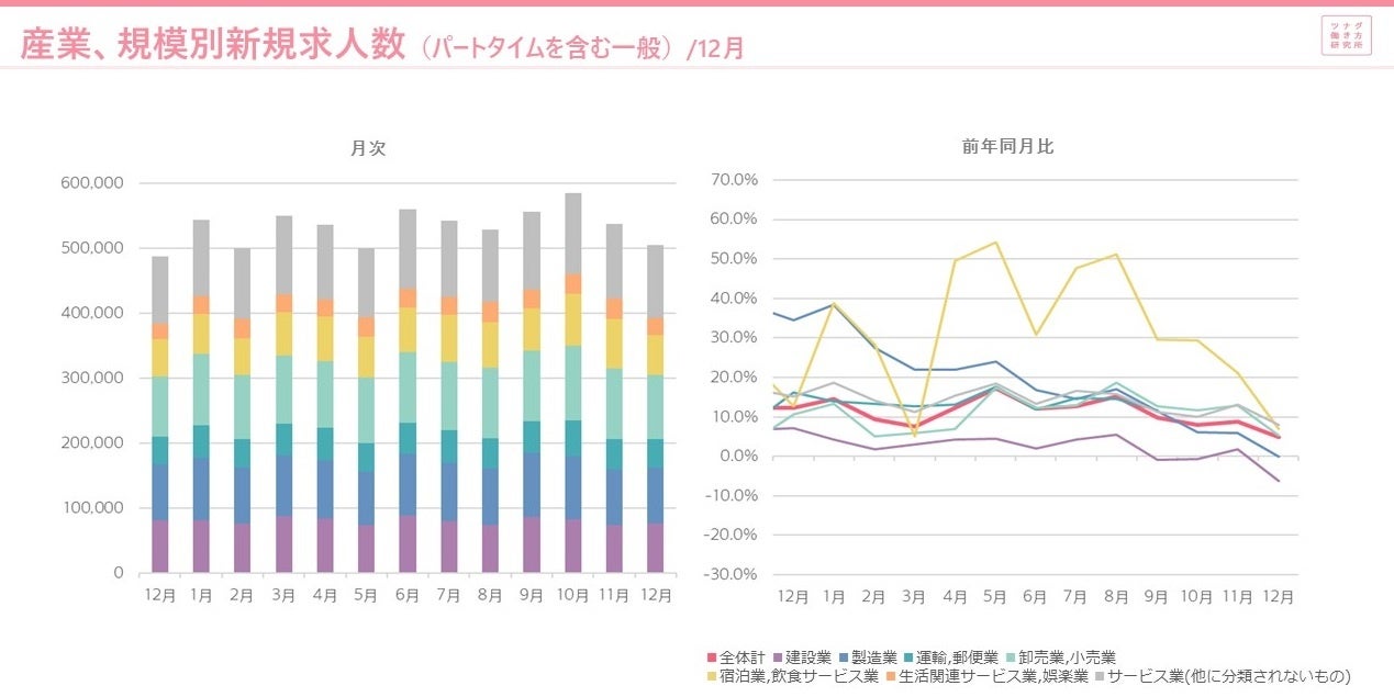 多様な働き方の調査研究機関「ツナグ働き方研究所(拠点:東京都千代田区/所長:平賀充記)」は、官公庁などが発表する労働市場関連のデータをキュレーションしつつ、分かりやすくまとめた「労働市場データレポート」を毎月発表していきます。今回は1月下旬に発表された最新データをもとに2022年12月度レポートについて、とりまとめましたのでご報告いたします。