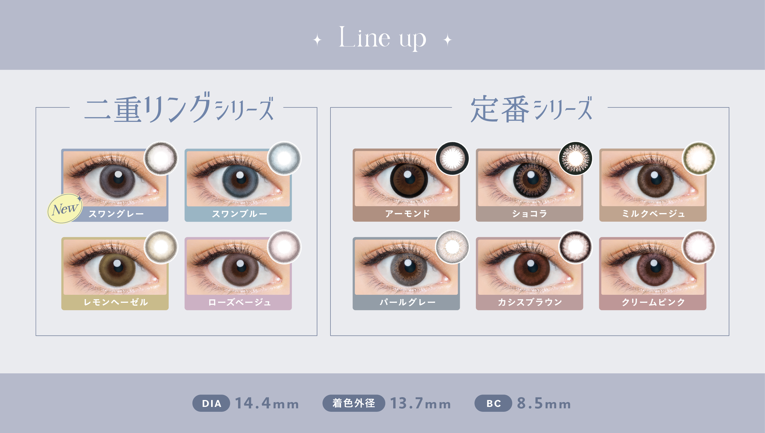 益若つばさデザインプロデュース「バンビシリーズワンデー」から、絶妙甘めグレーの新色『スワングレー』が新登場。昨年6月に発売され、現在もSNSを中心に多数の支持を集める『スワンブルー』の色違いとなっています。スワンブルーの透明感はそのままに、バンビシリーズらしいドーリーさも忘れないNEWカラー。