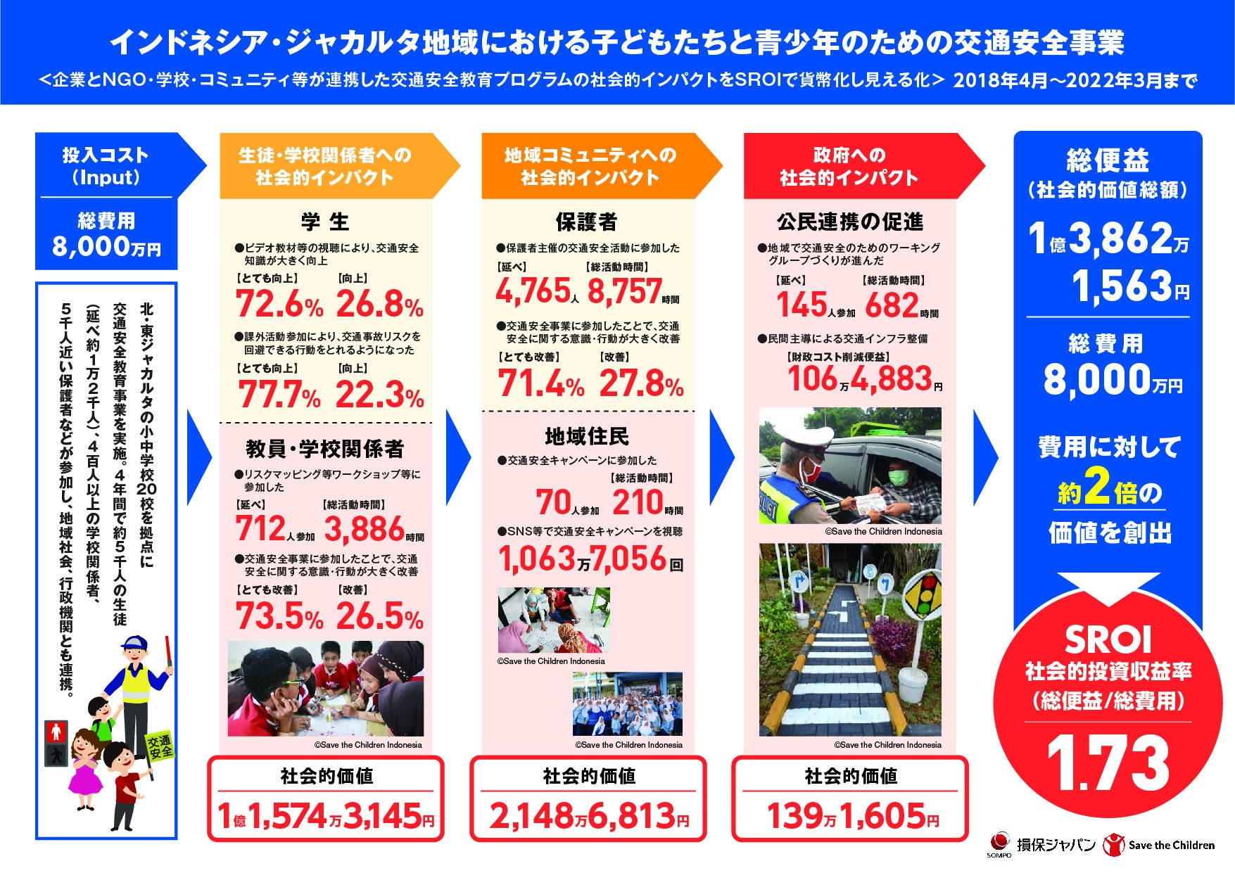 この度、2018年4月から2022年3月まで実施した「インドネシア・ジャカルタ地域における子どもたちと青少年のための交通安全事業」(以下「本プロジェクト」)について、活動量やアンケート結果などの定量的・定性的データをもとにSROIを算出し、取組みの有効性が確認できましたのでお知らせします。