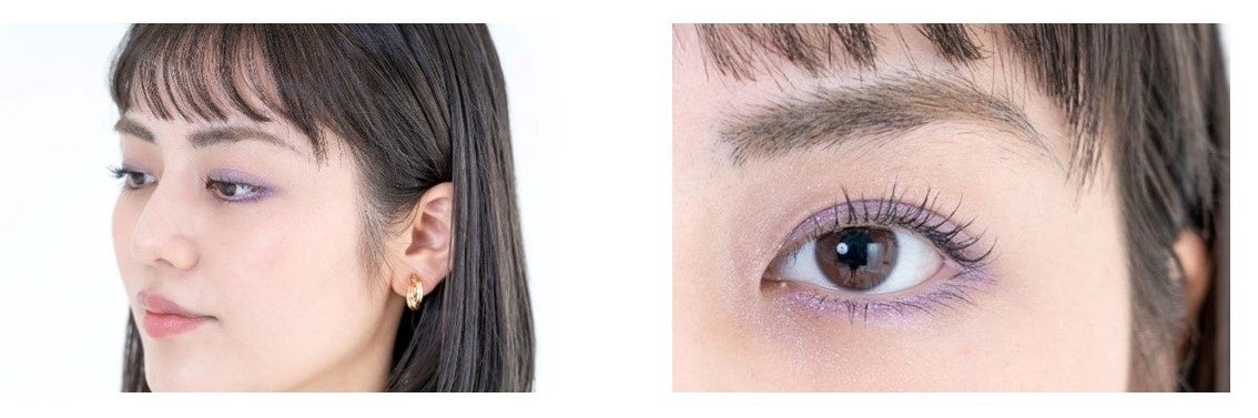 色味は女性とリンクさせ、淡いブルーのアイシャドウをチョイス。瞼全体には入れず部分的・黒目の延長線上にいれることで、クールでさりげないシティポップ感を演出した目元に。