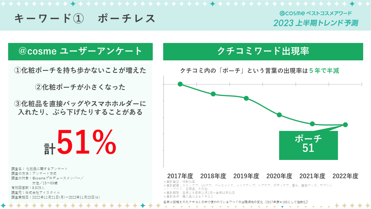 @cosmeのクチコミにおける「ポーチ」というワードの出現率をみてみると、5年で半減。2022年11月下旬に実施した、@cosmeユーザーを対象とした「化粧品に関するアンケート 」(以下、ユーザーアンケート)でも、「自身の意識や行動としてあてはまるもの」を聴取したところ、①化粧ポーチを持ち歩かないことが増えた、②化粧ポーチが小さくなった、③化粧品を直接バッグやスマホホルダーに入れたり、ぶら下げたりすることがあると回答した人の合計が全体の51%と半数を超えました。