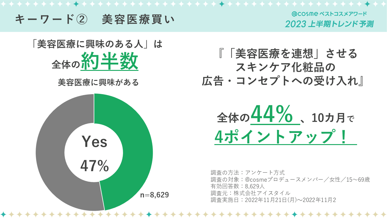 美容医療が、コスメ選択に影響を与える「美容医療買い」は2023年にますます加速しそうです。