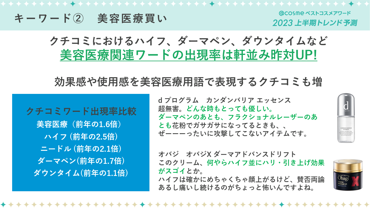 具体的には、ハイフ、ニードル、ダーマペン、ダウンタイムなど美容医療関連のワードの出現率が軒並み前年度からアップしているほか、化粧品の効果感や使用感を美容医療用語で表現するクチコミも増加しています。
