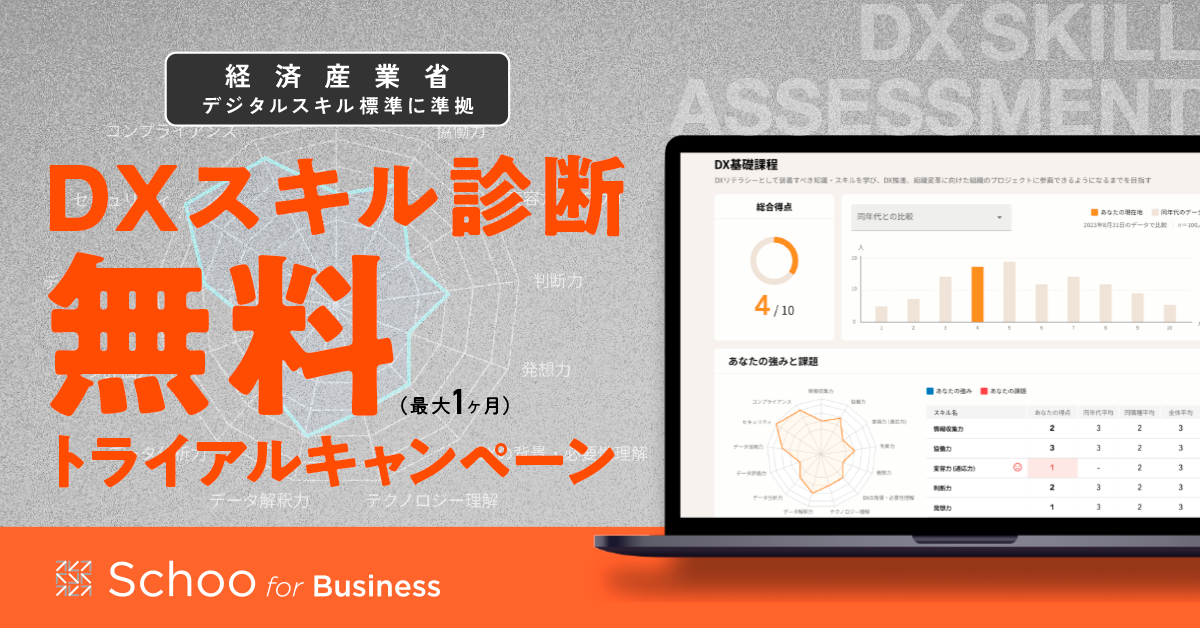 累計導入企業社数の3,500社突破を記念して、未だ「Schoo for Business」をご利用いただいたことのない企業様を対象にDXスキルを可視化できる新機能「DXスキル診断」及び「Schoo for Business」が期間限定で利用可能なキャンペーンを実施します。