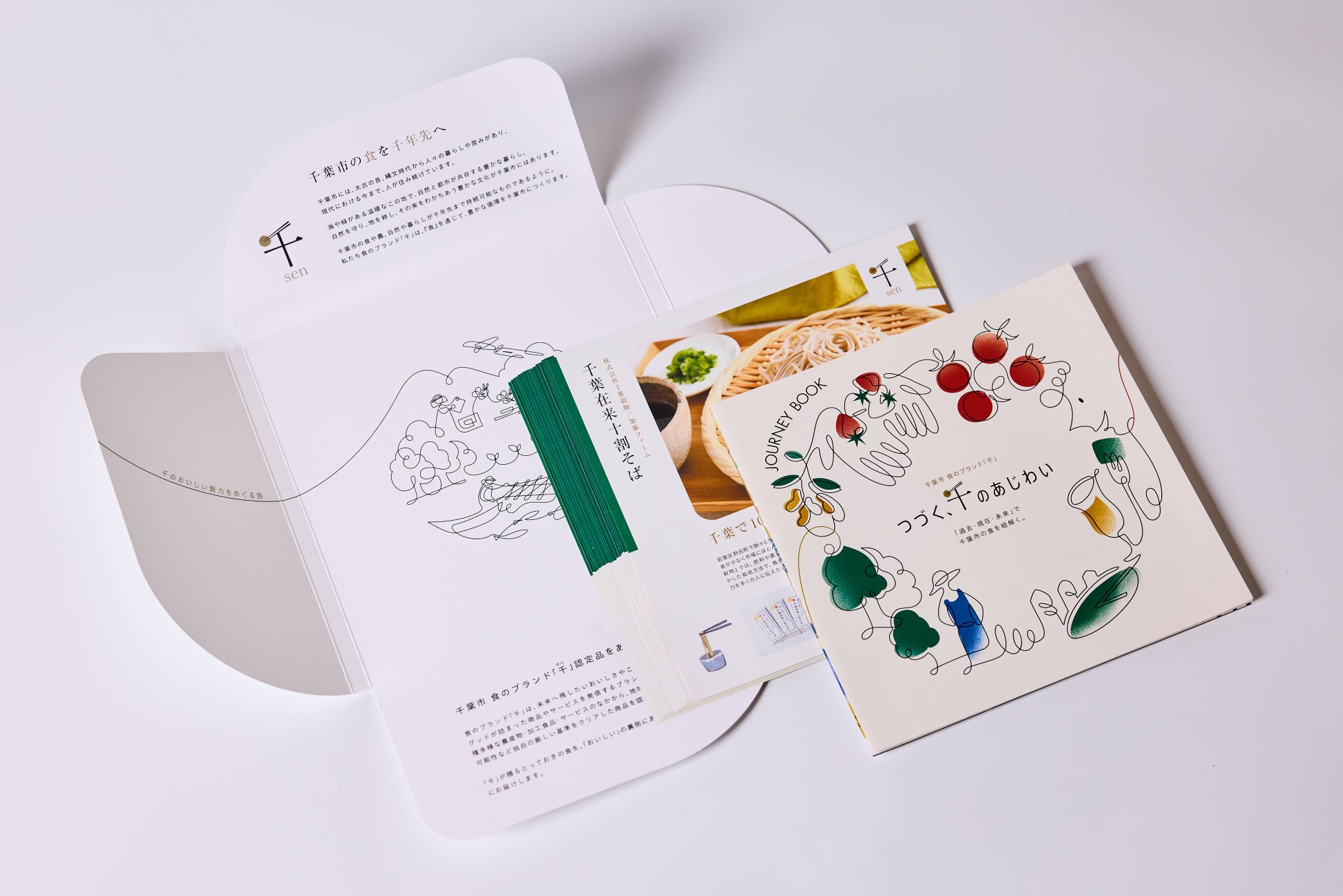 加曽利貝塚から続く千年の食文化や、千葉市の食に新たな可能性をもたらす最先端技術を記事として紹介。4つ折りの冊子を開くと、千葉市の特産品や食文化を巡るマップとして使えるデザインになっており、地域全体の食の魅力を俯瞰して楽しめる構成としました。