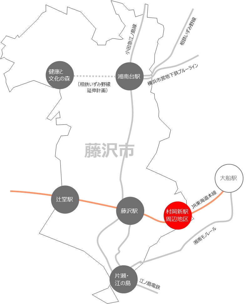 村岡新駅周辺地区は藤沢市の東端に位置し、JR 東海道本線藤沢駅から東に約2.0km、大船駅から南西に約2.6km に位置しています。鎌倉市深沢地区と一体的な土地区画整理事業(藤沢市村岡地区施行面積約7.3ha)を行うこととしており、本地区に係る村岡新駅については、神奈川県、藤沢市、鎌倉市及び東日本旅客鉄道株式会社にて、JR東海道本線大船・藤沢間の新駅設置に関する覚書を締結していて、2032年頃の開業が見込まれています。