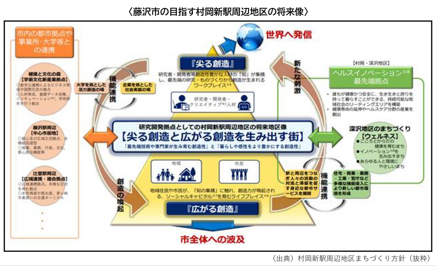 村岡新駅を中心に、知的人材の集積を活かし世界に誇る「尖る創造」と地域や市民と共に創り出す「広がる創造」が相互に作用することで好循環を生み出す、新たな研究開発拠点の形成を目指しています。