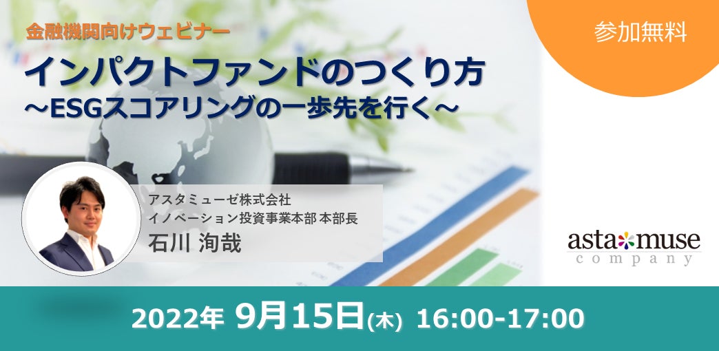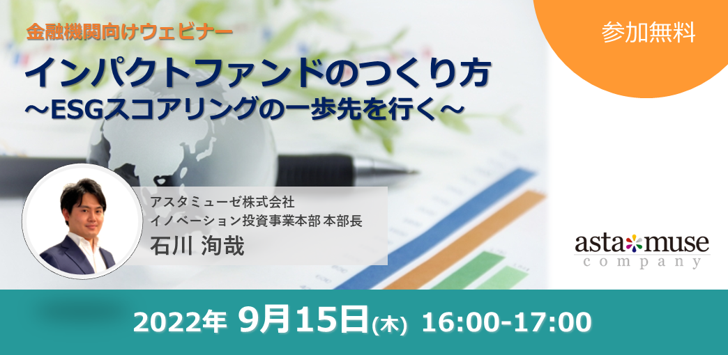 アスタミューゼ株式会社(本社:東京都千代田区、代表取締役社長 永井歩)は、9月15日(木)16時より「インパクトファンドのつくり方~ESGスコアリングの一歩先を行く~」と題し、無料ウェビナーを開催いたします。