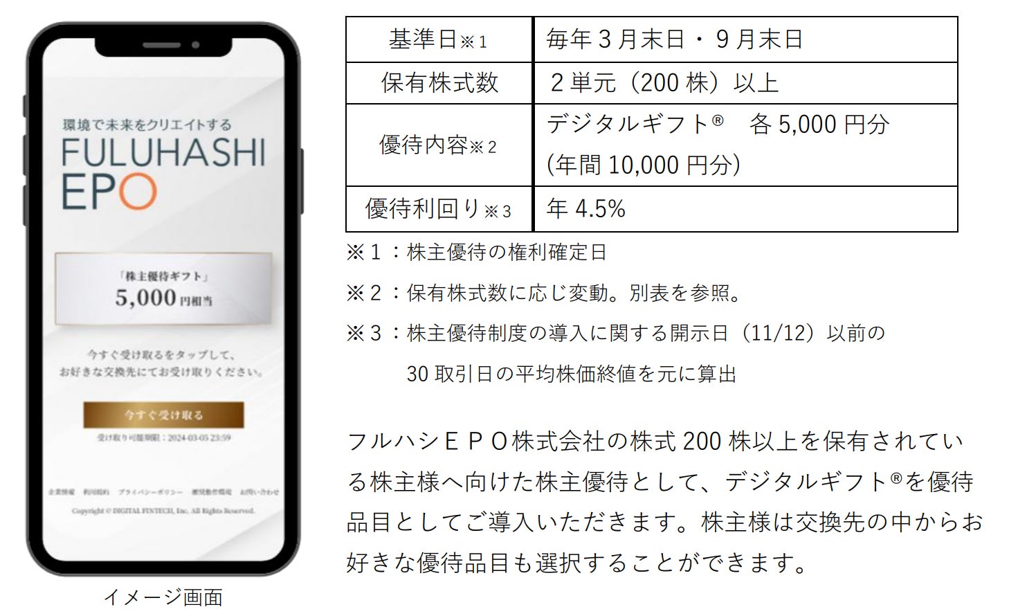 フルハシEPO株式会社(代表取締役社長:山口 直彦、東証スタンダード市場・名証メイン市場:証券コード9221)において、株式会社デジタルプラス(代表取締役社長:菊池 誠晃、本社:東京都渋谷区、東証グロース市場:証券コード3691)グループが運営する「デジタルギフト®」を株主優待としてご活用いただくことになりました。
