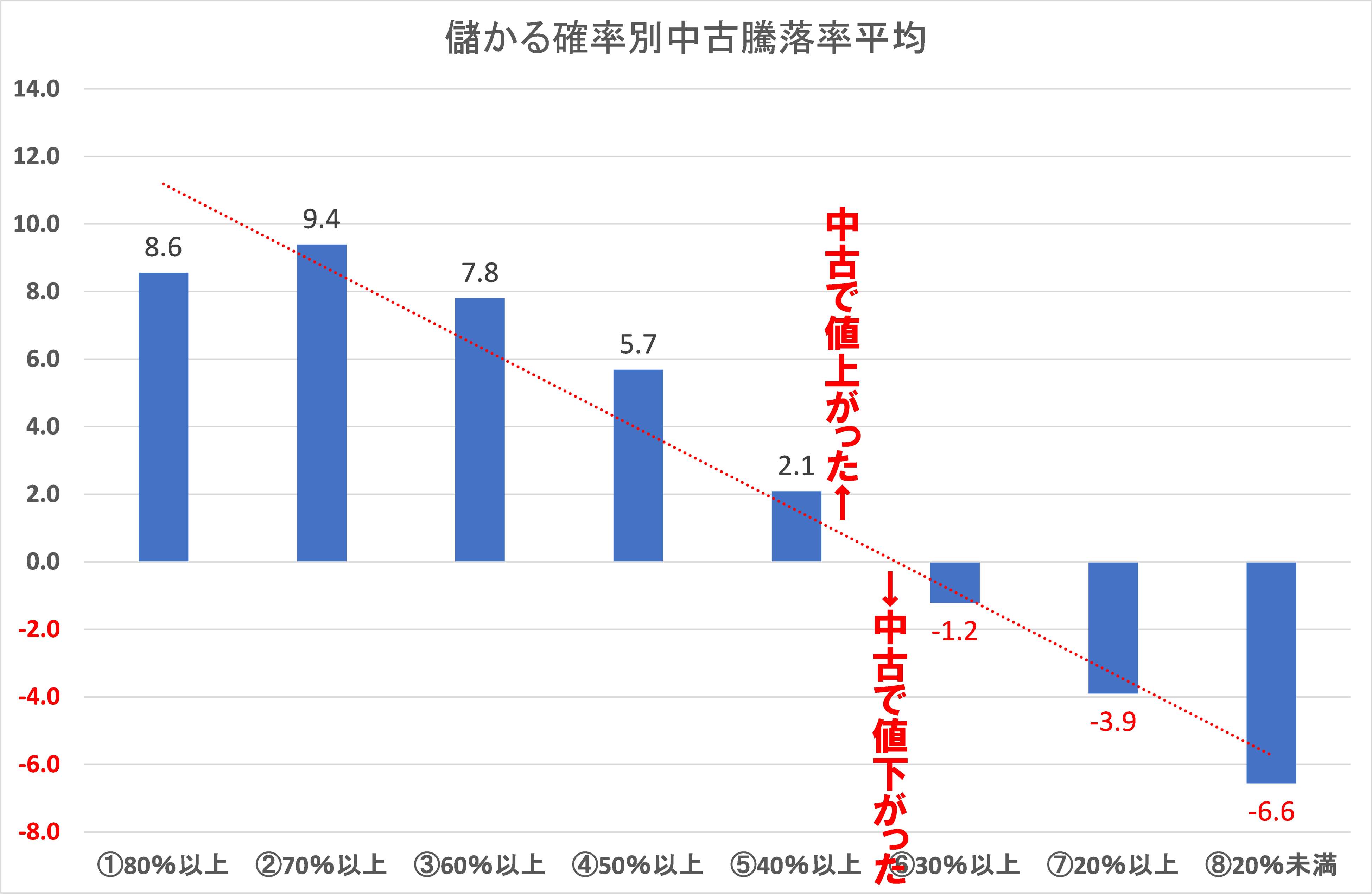 この結果検証は以下で証明されています。儲かる確率が高い程、中古になって価格が値上がりしていることを表しています。