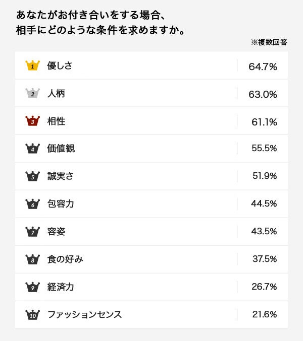 ちなみに、「結婚する相手に求める条件」ベスト3も、お付き合いする相手の場合と同じ「優しさ(63.0%)」「人柄(60.3%)」「相性(58.7%)」でした。