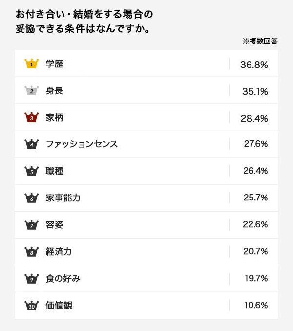 そして「結婚相手に妥協できるポイント」をお聞きしたところ、ベスト3は「学歴」「身長」「ファッションセンス」となりました。特に大きな違いは「家事能力」。付き合う相手の場合25.7%で6位なのに対し、結婚相手では16.1%の9位と、大きくランキングが変動しています。