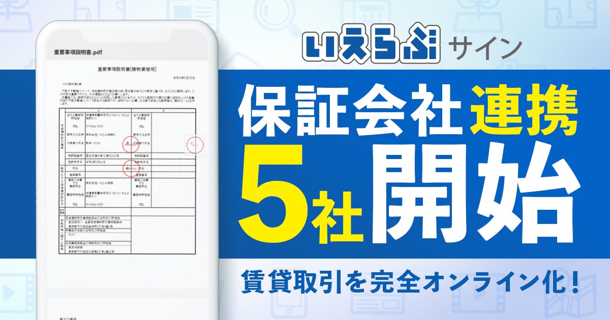 株式会社いえらぶGROUP(本社:東京都新宿区、代表:岩名泰介、以下「いえらぶGROUP」)が提供する不動産業務に特化した電子契約システム「いえらぶサイン」は、本日2022年8月19日より、下記5社の家賃保証サービスと連携を開始します。