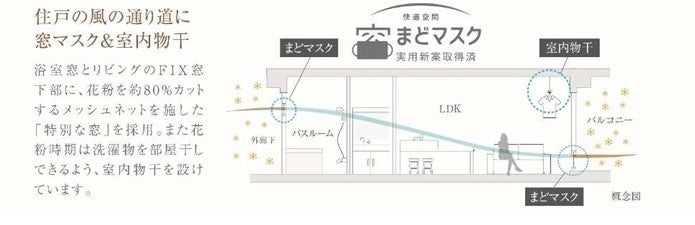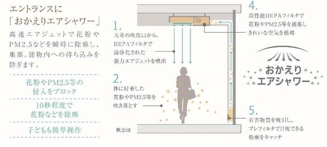 マンションのエントランス付近には、花粉除去設備「おかえりエアシャワー」を設置し、自宅に入る前に風の力で花粉やPM2.5等の有害物質を落とすことができるほか、室内に風を通しながら、花粉などを80%カットする「快適空間 まどマスク」を導入いたしました。これにより、現在、花粉症に悩む方に快適な住環境をお届けできるだけでなく、花粉症発症の予防にもつながります。