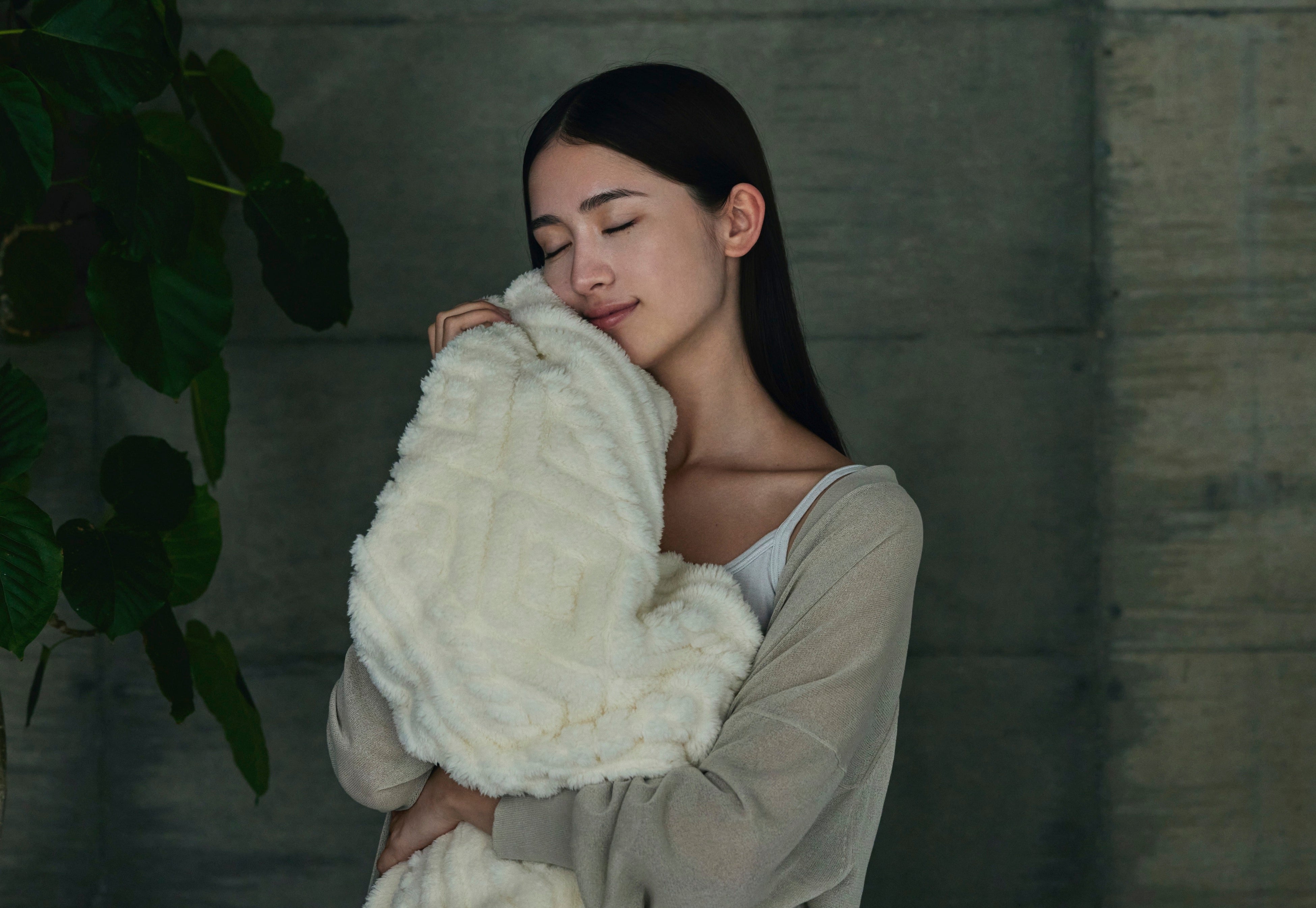 セリ科の植物、ツボクサから抽出されるエキス=CICAによる柔軟加工を施すことで、生地のやわらかさを引き立てます。お休み前に、心地よい風合いのブランケットに包まれてリラックスタイムを。