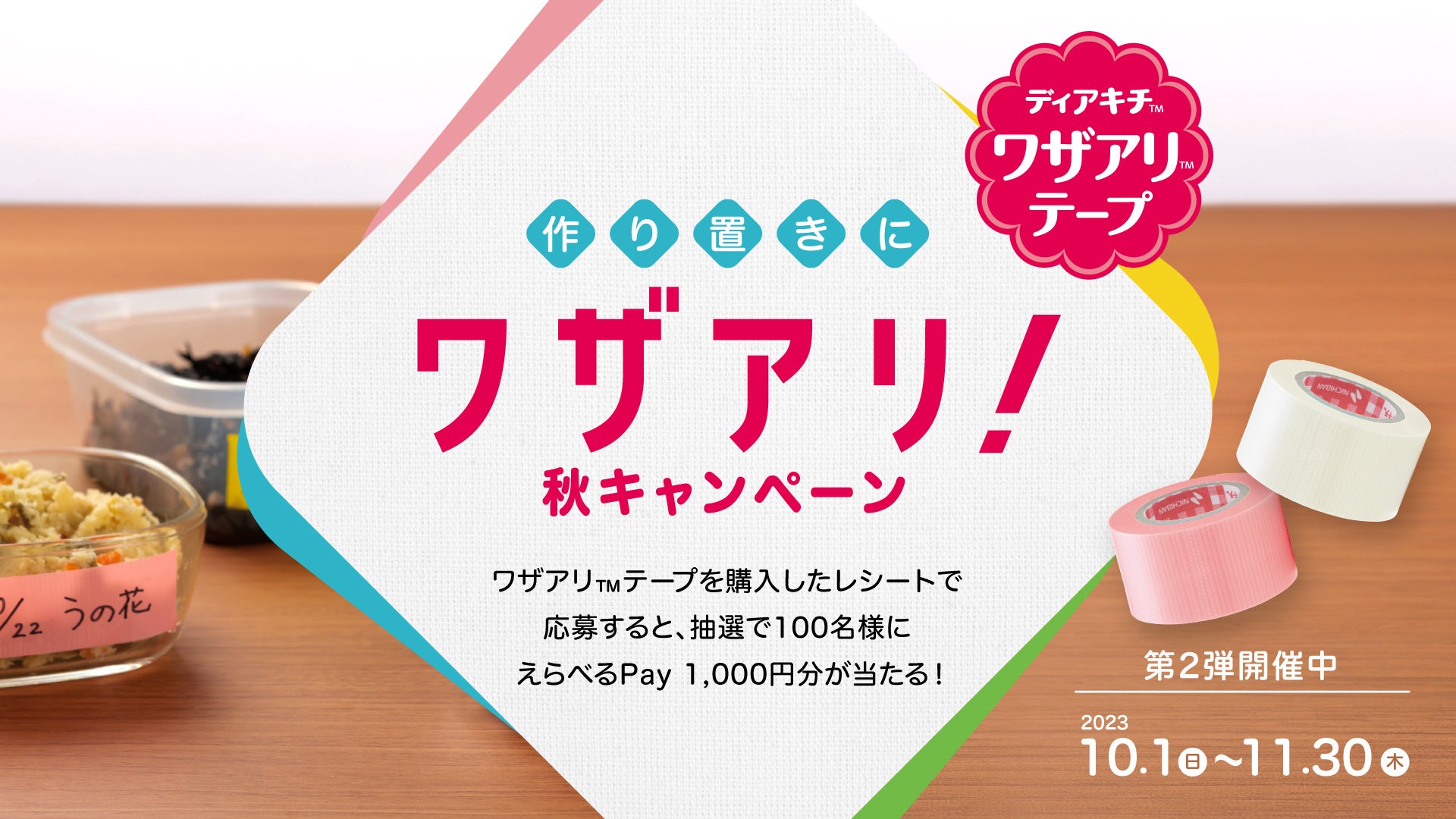 10月1日より、ワザアリ(TM)テープを購入したレシートを撮影して応募すると、抽選で100名様にえらべるPay1,000円分が当たる「作り置きにワザアリ!秋キャンペーン」を開始します。