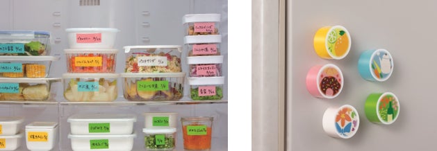 「ディアキチ(TM)ワザアリ(TM)テープ」は、食品袋の封止めはもちろん、保存容器やフリーザーバッグの日付・内容物のラベルなどに使える便利なテープです。マグネットホルダー付きで、冷蔵庫に貼り付けて保管することができます。
