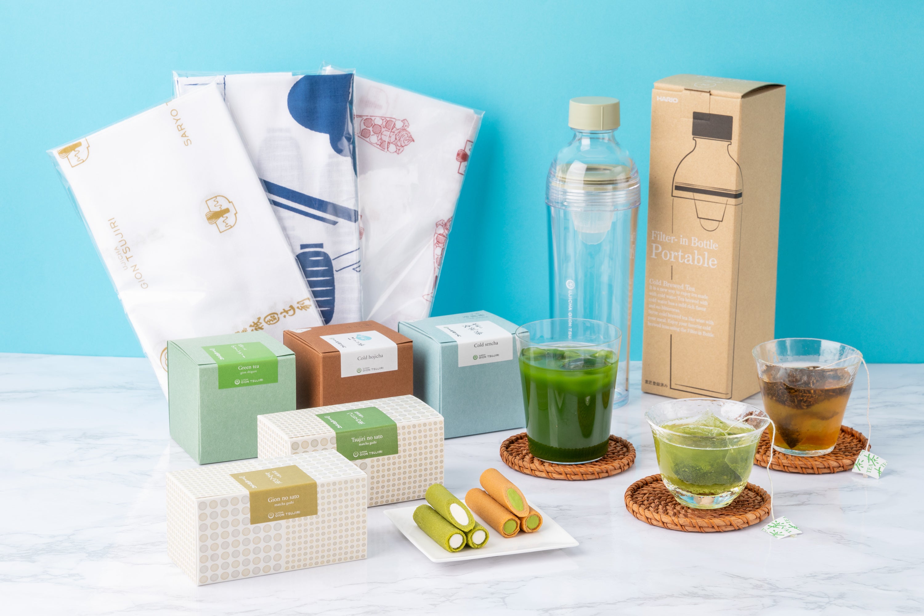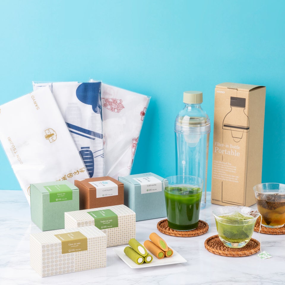 短時間ながら茶葉の成分をしっかりと抽出でき、この時期の健やかに過ごすために常備しておきたい水出しの「冷煎茶」と「水出しほうじ茶」、「グリーンティー」をはじめ、定番のお菓子や、幅広く使えて割れにくい「フィルターインボトル400ml」、さらに京都の祇園祭ムードを少しでも感じていただけるよう、特製(非売品)の限定オリジナル手ぬぐいを3種ご用意しました!