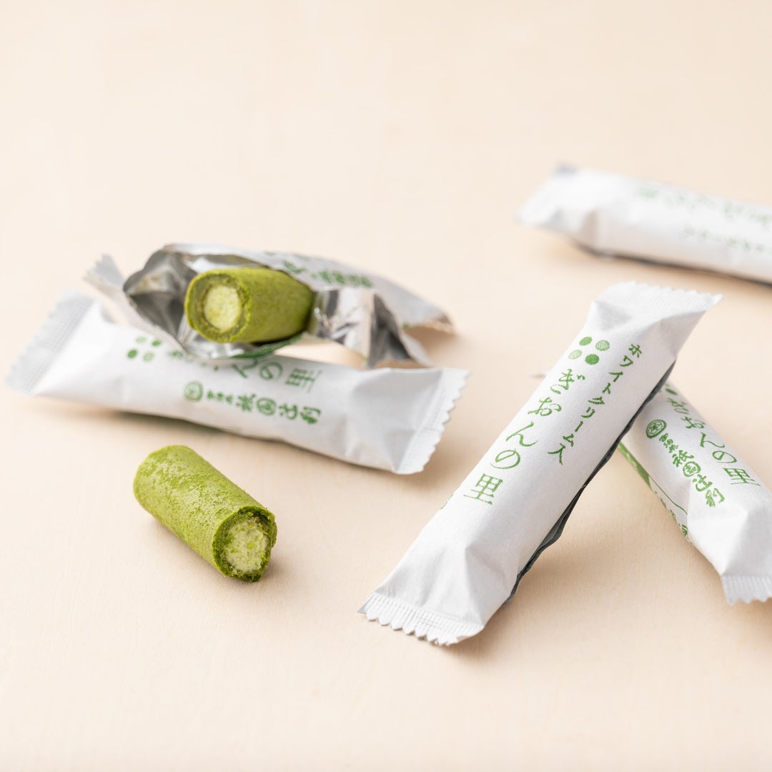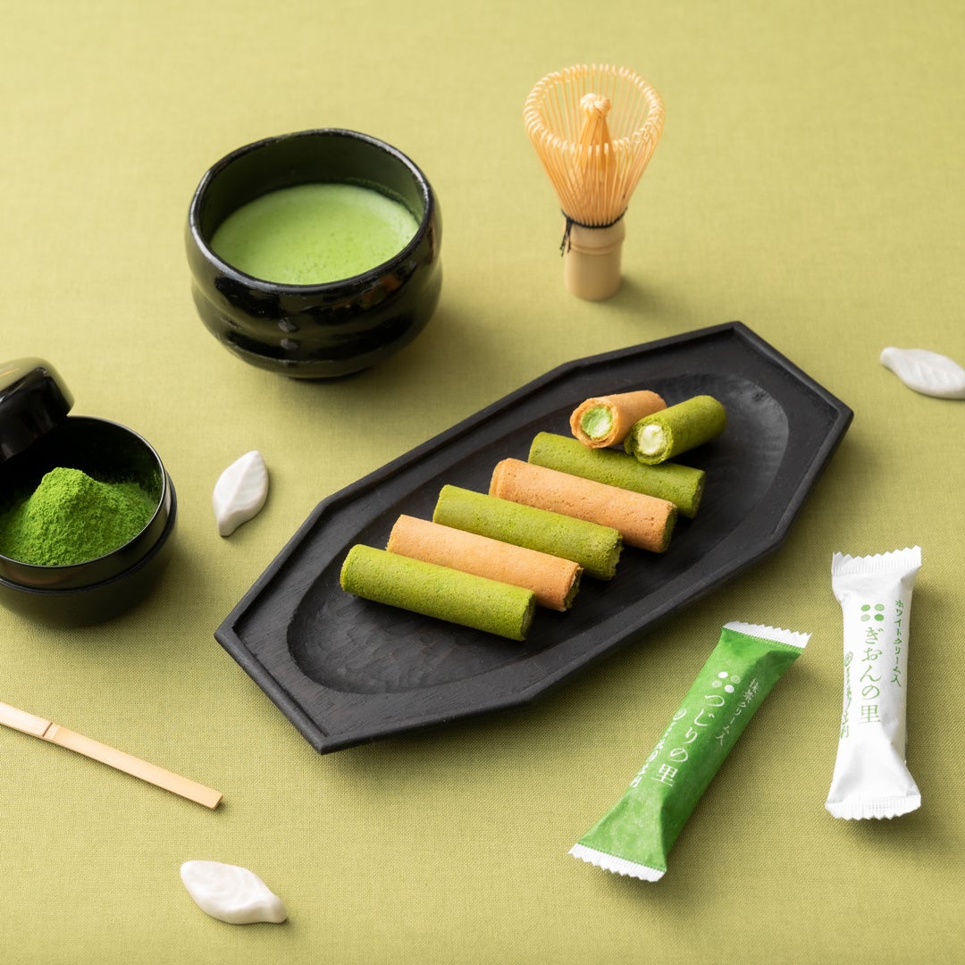濃厚な石臼挽き抹茶クリームを丁寧に焼き上げた薄焼きロールせんべいで包んだ、祇園辻利人気No.1の抹茶菓子。
