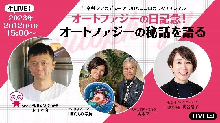 UHA味覚糖株式会社(本社:大阪市中央区、代表取締役:山田泰正)は、運営するYouTubeチャンネル「UHAココロカラダチャンネル」にて、先端美容を追求し、エイジングケア美容液ブランドのfracora(フラコラ)運営「生命科学アカデミー」と共に、大阪大学 医学部教授 吉森保先生ほか、豪華ゲストをお招きしたオンライン生配信イベント『2月12日“オートファジーの日”記念!オートファジー秘話』を2023年2月12(日)15:00より開催いたします。