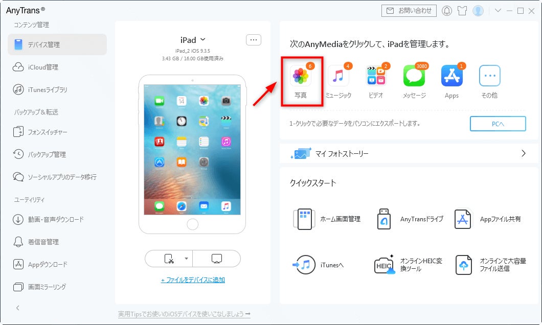AnyTransは、Windows PCおよびMacからiPad/iPhoneにデータを一括転送できるソフトウェアです。写真、音楽、ビデオ、連絡先、メッセージ、アプリケーション、iBooksなどの全てのデータに対応しており、簡単な操作で高速に転送できます。