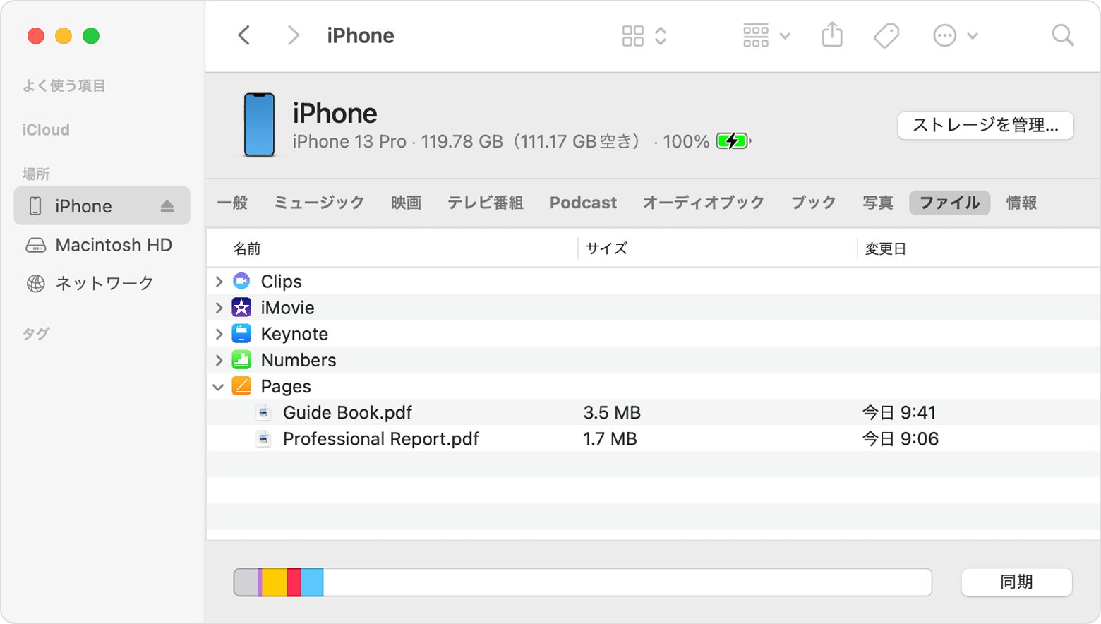 Finderを起動して「ファイル」タブをクリックし、ファイル共有に対応した App のリストを確認します。「ファイル」セクションが表示されない場合は、ファイル共有に対応した App がデバイス上にありません。