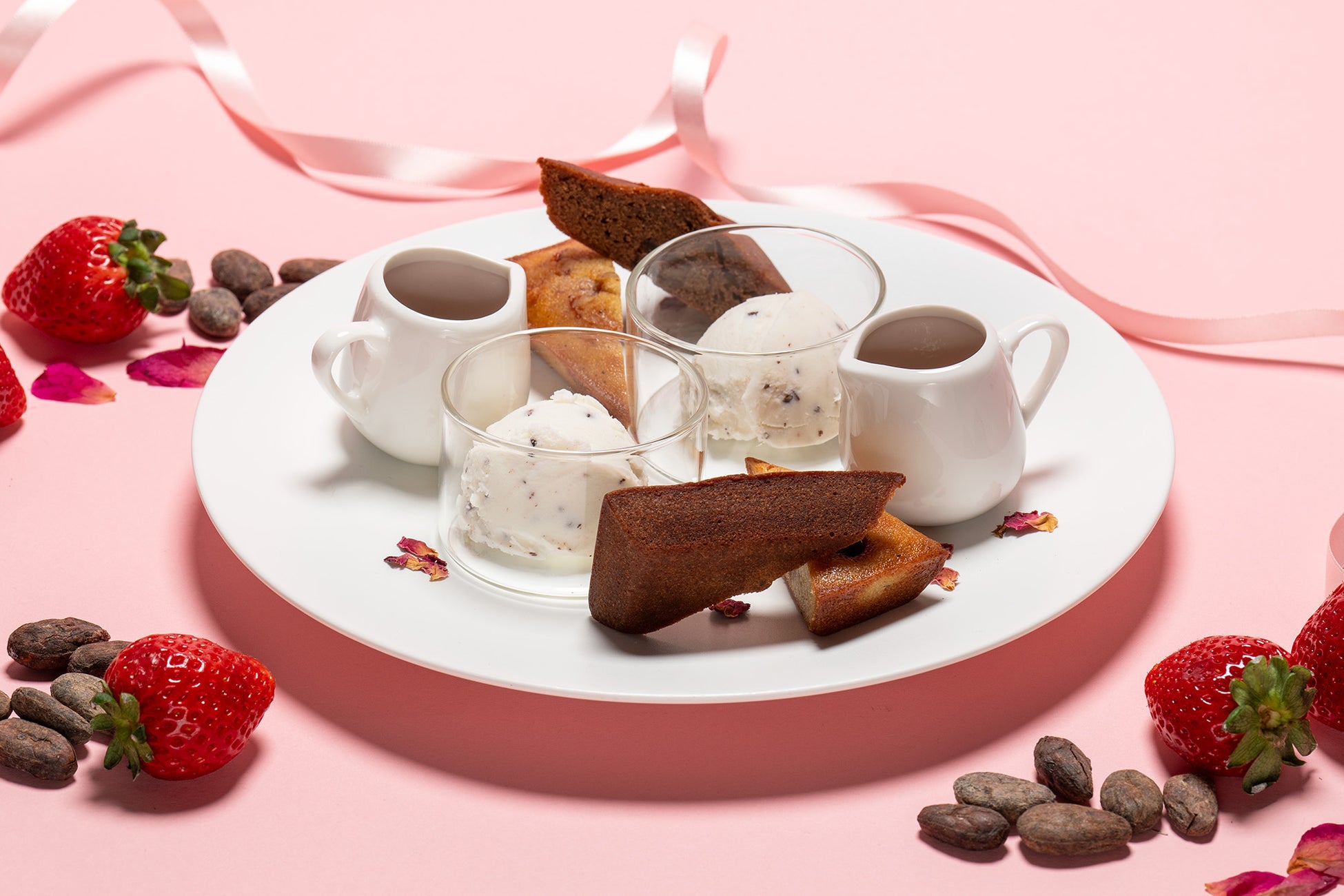 今回はバレンタイン・ホワイトデーシーズン限定Ver.として、ガトーショコラやフィナンシェ、アイスやサラダに苺をふんだんに用いています。また、別皿では新作のボンボンショコラ8種のうち4種をお楽しみいただけます。