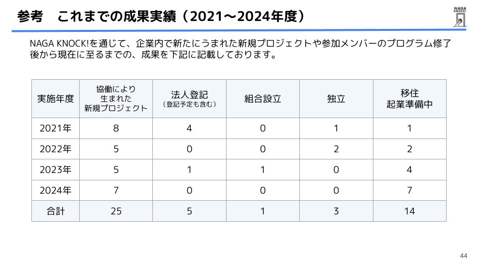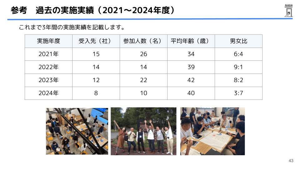 今回で5期目となるNAGA KNOCK!ですが、これまで受入企業は49社*、人材は72名の方にご参加いただきました。過去参加者の中からは、長野市で登記をして新たに事業を始める方、副業先の社長と一緒に共同会社を立ち上げる方、実際に長野市に移住する方など、続々と新たなアクションが生まれてきています。