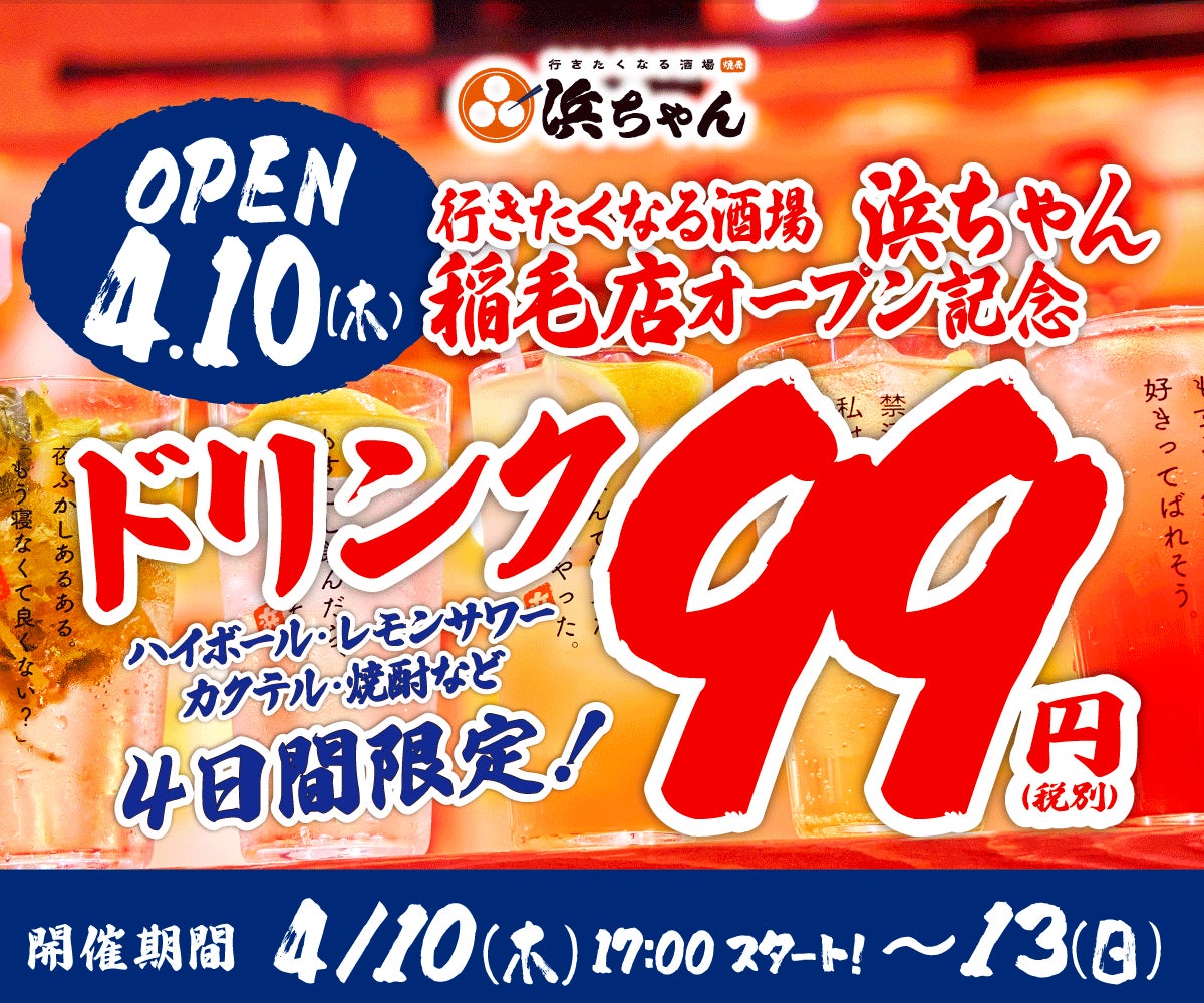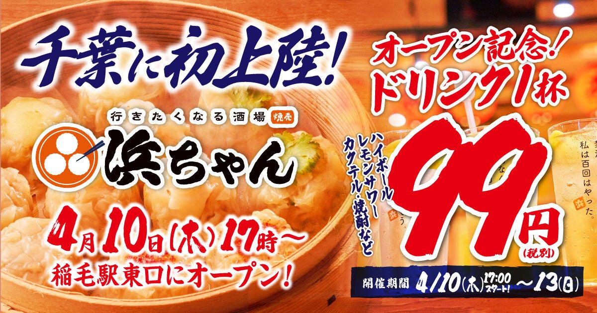 【ドリンク1杯99円】「行きたくなる酒場 浜ちゃん」が4月10日(木)に千葉初上陸!オープンを記念して自慢のレモンサワーなど1杯99円でご提供!
