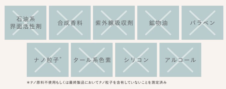 100%天然由来成分にこだわり、9つの成分は使用していません。また、石けんで落とすことができ、肌への負担を軽減します。