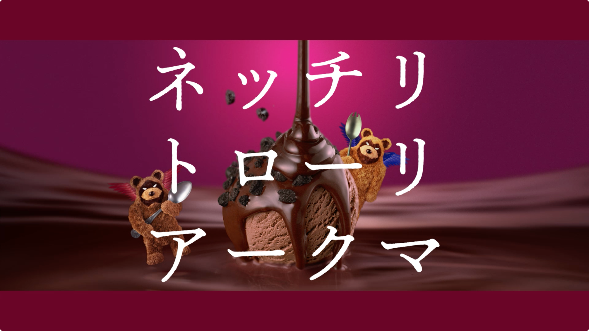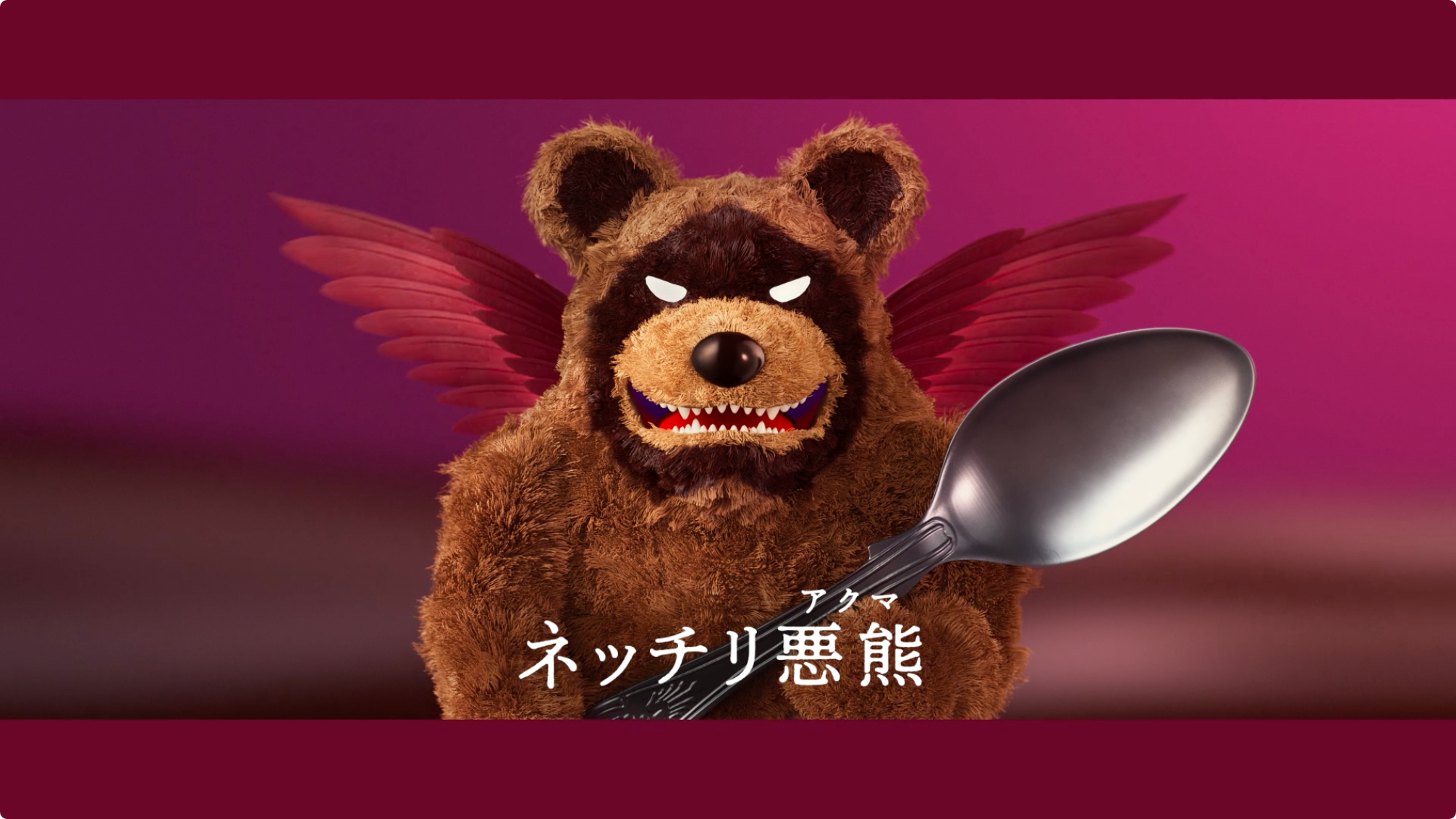Web CMでは、“悪態をつく熊”の “ネッチリ悪熊” と“トローリ悪熊”が登場。ミニカップ 悪魔のささやきの魅惑的な見た目と一度食べたら虜になる濃厚な味わいについて、うっとりするような声でささやいて誘惑します。なお、2体の悪熊の声は、2人の人気声優が担当しています。