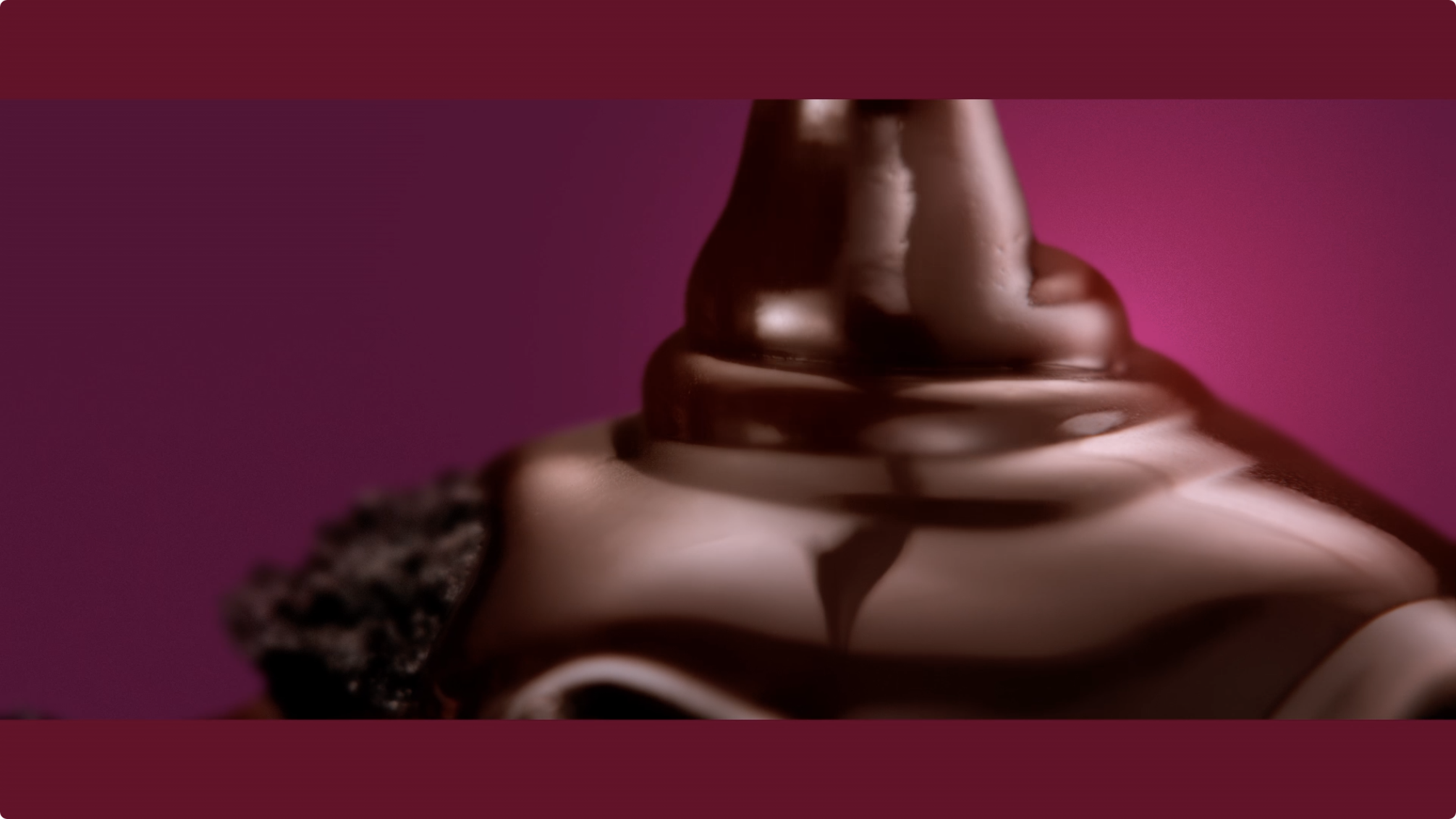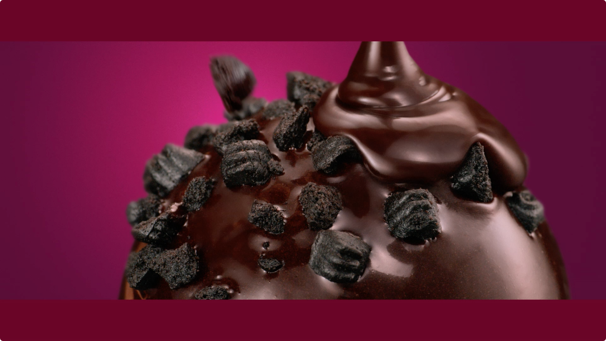 ビターチョコレートソースを混ぜ込んだ滑らかなチョコレートアイスクリームの上に、とろーりとしたミルクココアソースにまみれた、ねっちり食感のチョコレートクッキーを載せました。